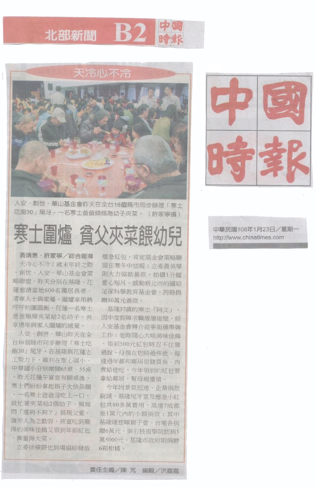 人安、創世、華山策略聯盟,盼匯集社會愛心為寒士(街友、待拉單媽、社會邊緣人)辦理第28屆寒士飽30尾牙,將於107年2月4日(日)全台16場同步辦理,預計邀請4萬名寒士,善款如有結餘,作為常年服務之用。